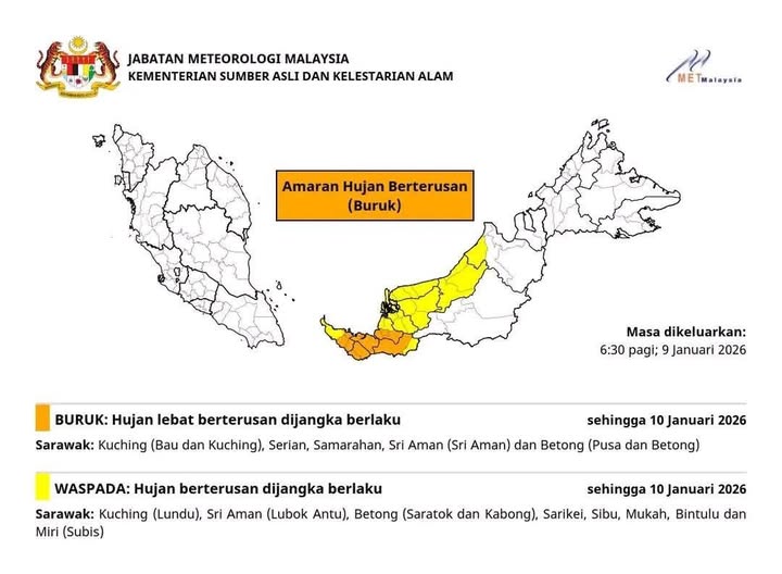 Hujan lebat berterusan dijangka berlaku di negeri Sarawak: Kuching (Bau dan Kuching), Serian, Samarahan, Sri Aman (Sri Aman) dan Betong (Pusa dan Betong) sehingga Sabtu, 10 Januari 2026.