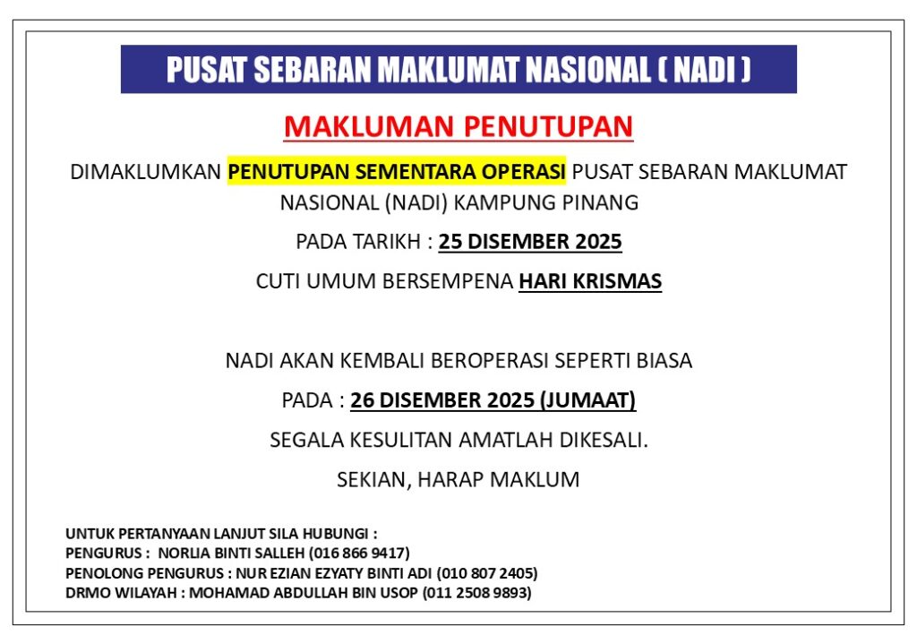 Dimaklumkan penutupan sementara operasi Pusat Sebaran Maklumat Nasional (NADI) Kampung Pinang sempena cuti umum Hari Krismas pada: